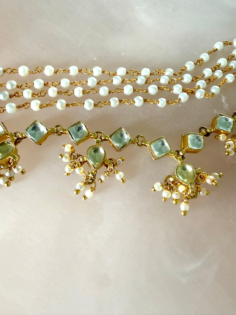 The Aarna Hair Chain is a graceful accessory designed to add subtle elegance to traditional hairstyles. Crafted in a gold-toned finish, it features layered pearl strands paired with soft square-cut stones and delicate pearl cluster drops that add gentle movement.