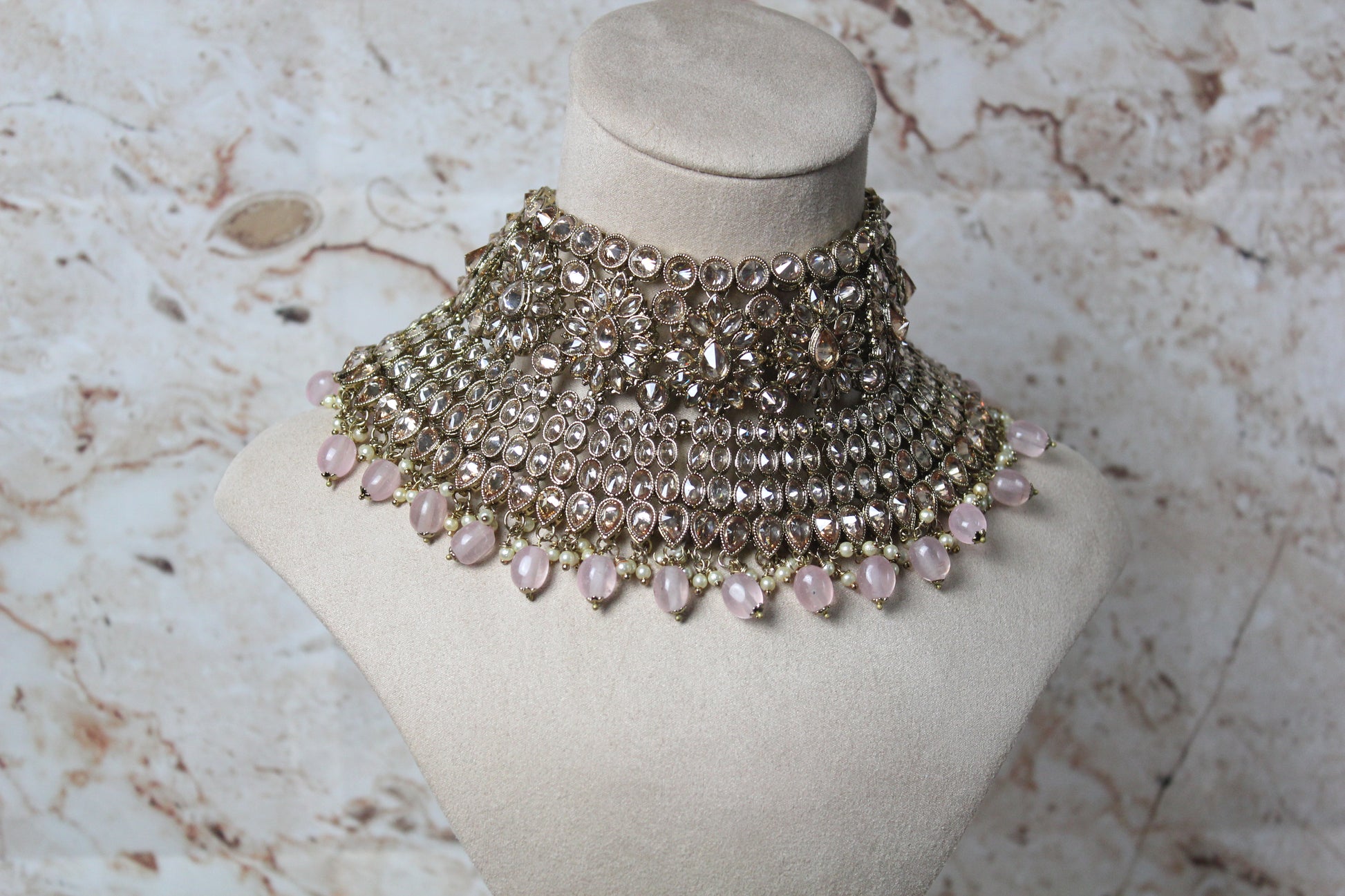 A classic bridal set that will stand out with your gorgeous outfit. This antique bridal set is made of zircon crystals and statement beads. The set comes complete with necklace, earrings, tikka and passa/jhumar in a beautiful matching finish.