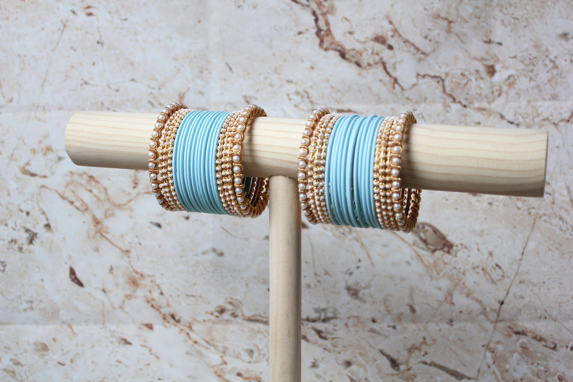 A bangle set with stunning coloured bangles and statement gold bangles for both hands.