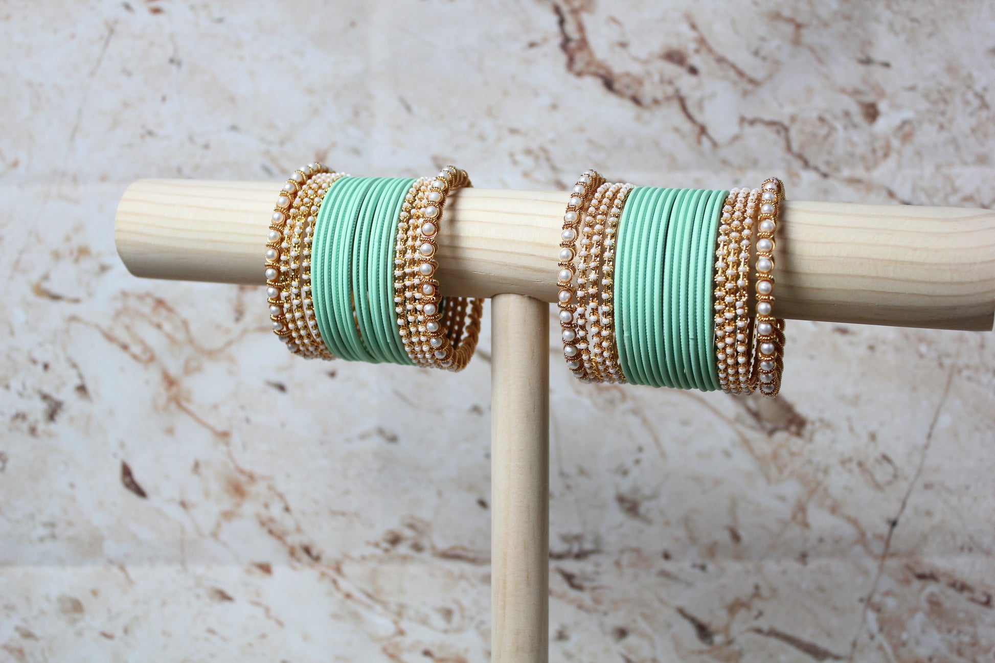 A bangle set with stunning coloured bangles and statement gold bangles for both hands.