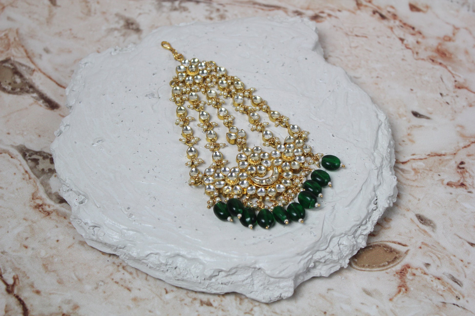 An elegant passa (jhumar) adorned with pachi kundan stones on a gold-plated base. This piece will look stunning however you choose to accessorise it!