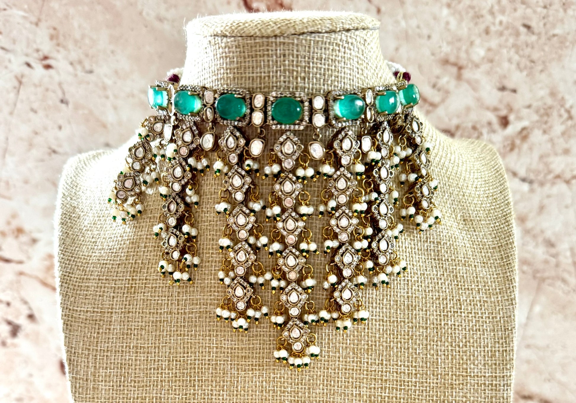 The Mahira Necklace Set is a striking choker designed to bring colour and movement to bridal and festive looks. Set in a gold-toned finish, it features oval green stones along the neckline, paired with cascading kundan motifs and delicate pearl detailing that create a rich, layered effect.