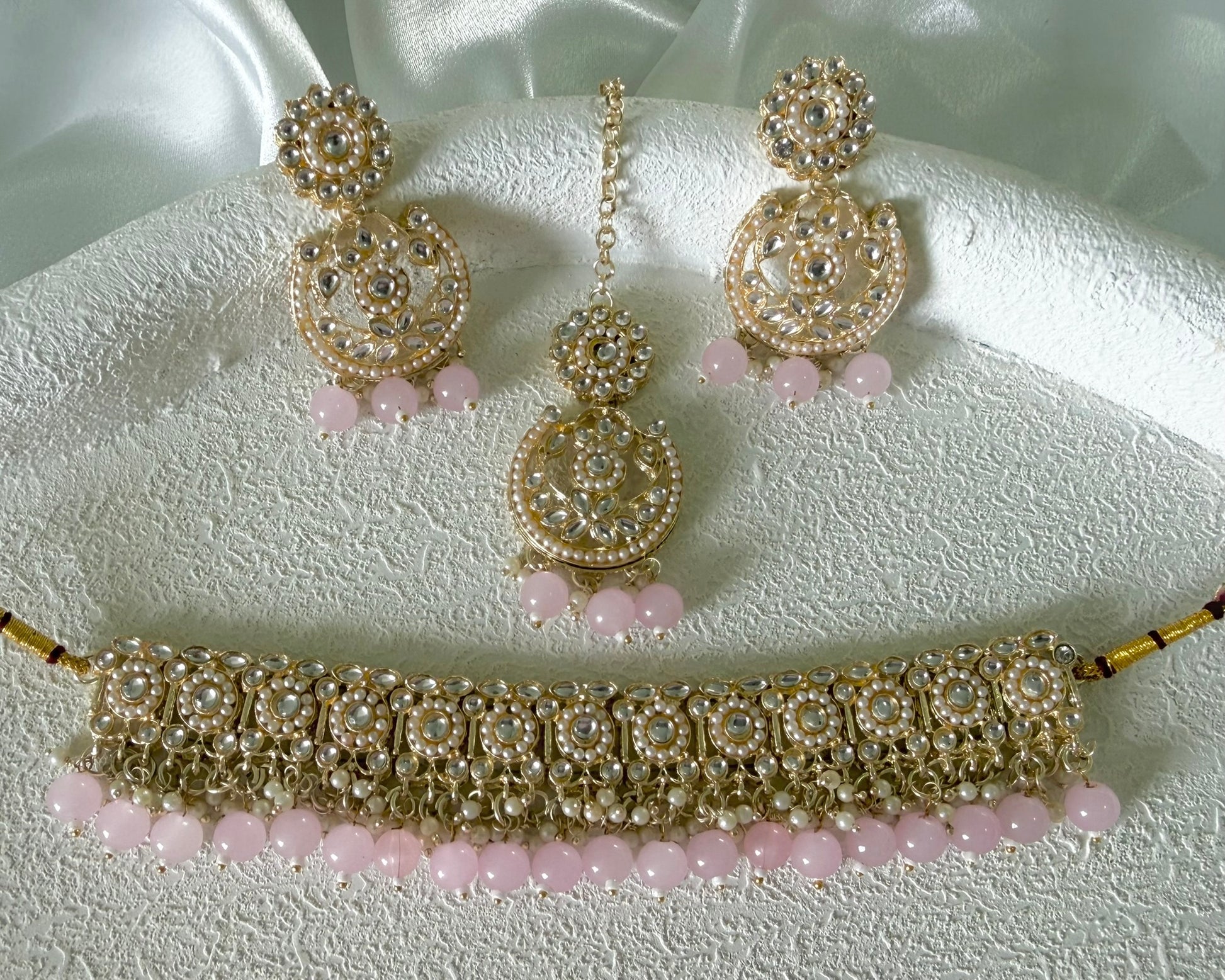 The Tina Necklace Set is a graceful choker designed with timeless elegance and intricate detailing. Crafted in a gold-toned finish, it features kundan-style stones arranged in delicate motifs, finished with cascading drop accents that add soft movement and charm.