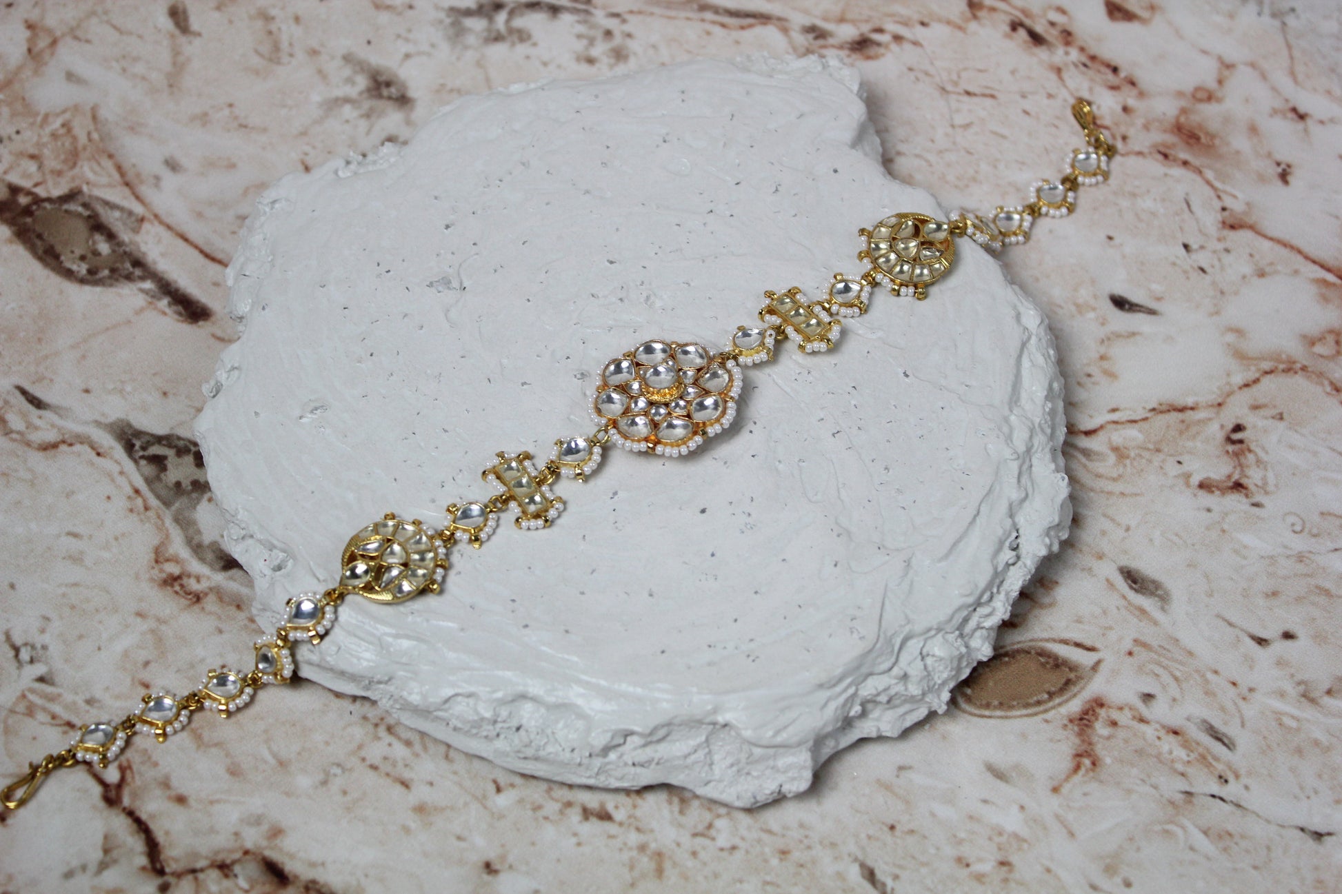 This glamorous sheeshphool is adorned with intricate kundan stones and will add an elegant and modern touch to any ensemble!