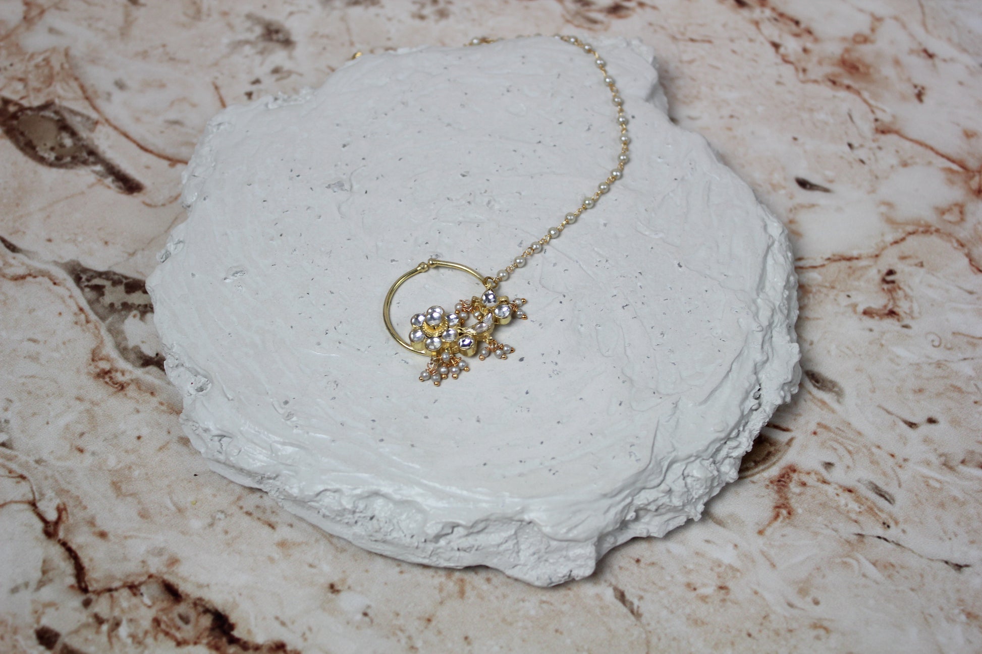 A cute nose stud with an elegant single chain, suitable for non-pierced noses. It can also be worn over a nose stud for pierced noses.