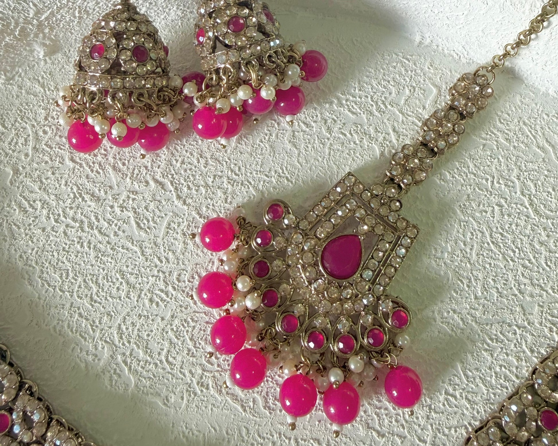 The matching jhumka-style earrings and coordinating maang tikka complete the set, making it a striking choice for weddings, festive celebrations, and special occasions.