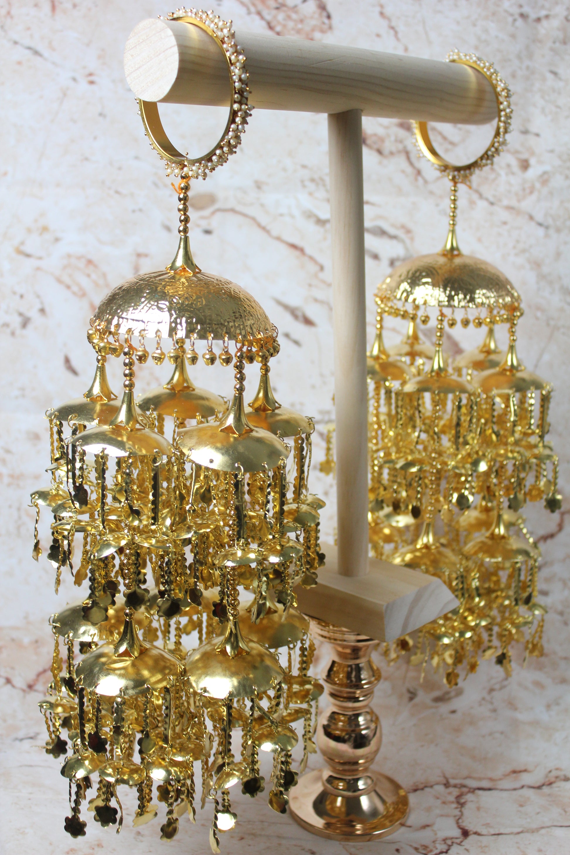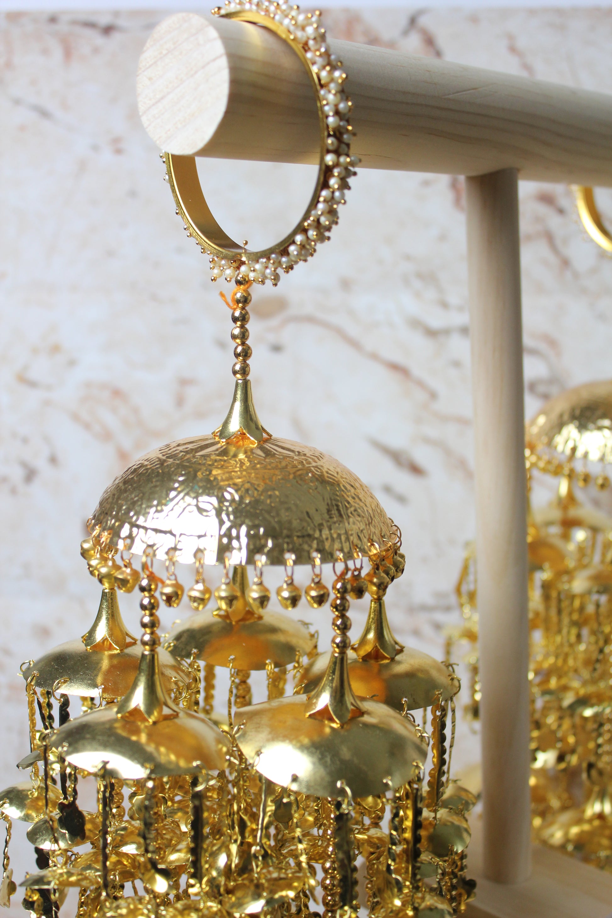 These stunning kaleera are set on a gold base with three layers of hanging jhumkis and bangles adorned with pearls. The kaleera are approximately 50cm in length.