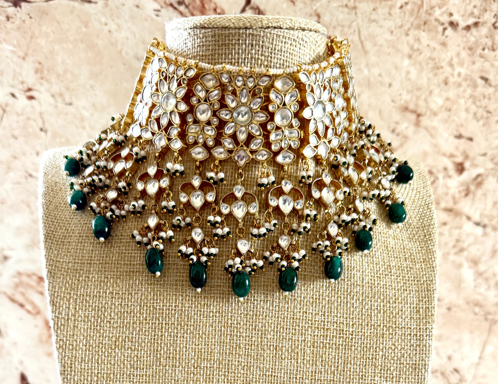 The Suvarna Bridal Necklace Set is a classic full-neck choker designed for timeless bridal elegance. Crafted in a rich gold-toned finish, it features intricate floral kundan motifs arranged across a wide choker base, finished with cascading pearl clusters and deep green bead drops for added depth and movement.