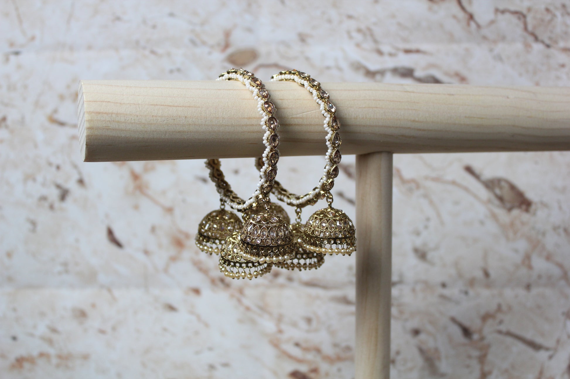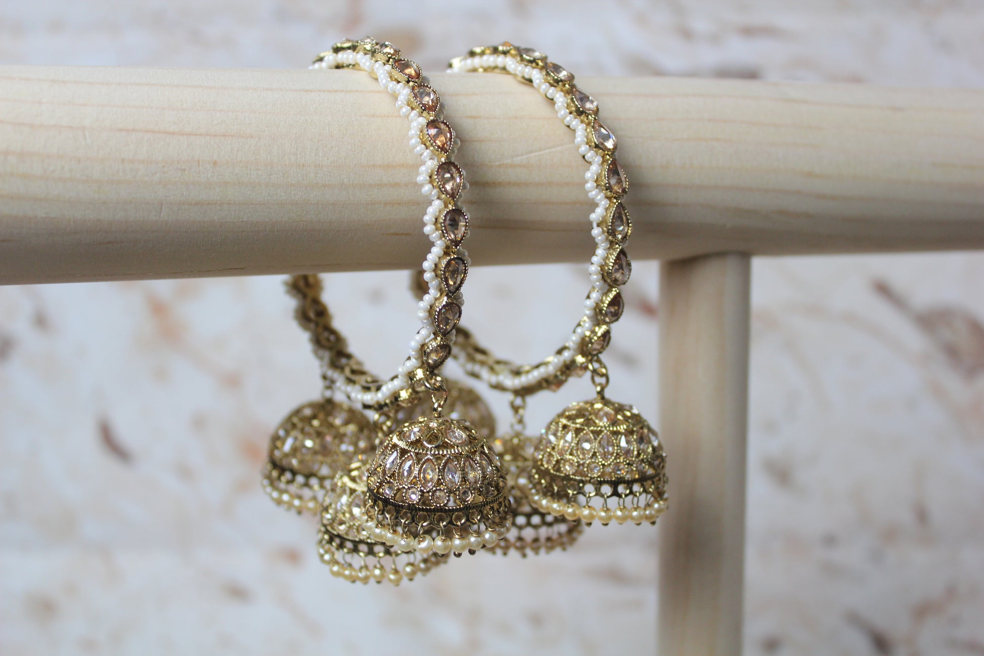 Statement bangles embellished with gold stones and pearl work with hanging jhumkis. This set comes with 2 bangles.