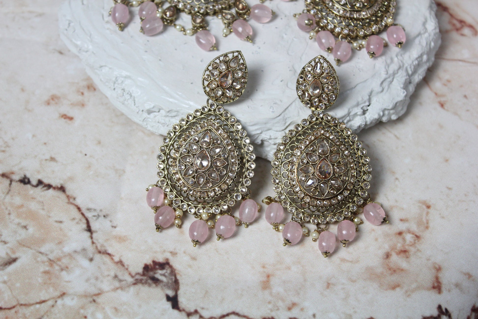 A classic bridal set that will stand out with your gorgeous outfit. This antique bridal set is made of zircon crystals and statement beads. The set comes complete with necklace, earrings, tikka and passa/jhumar in a beautiful matching finish.
