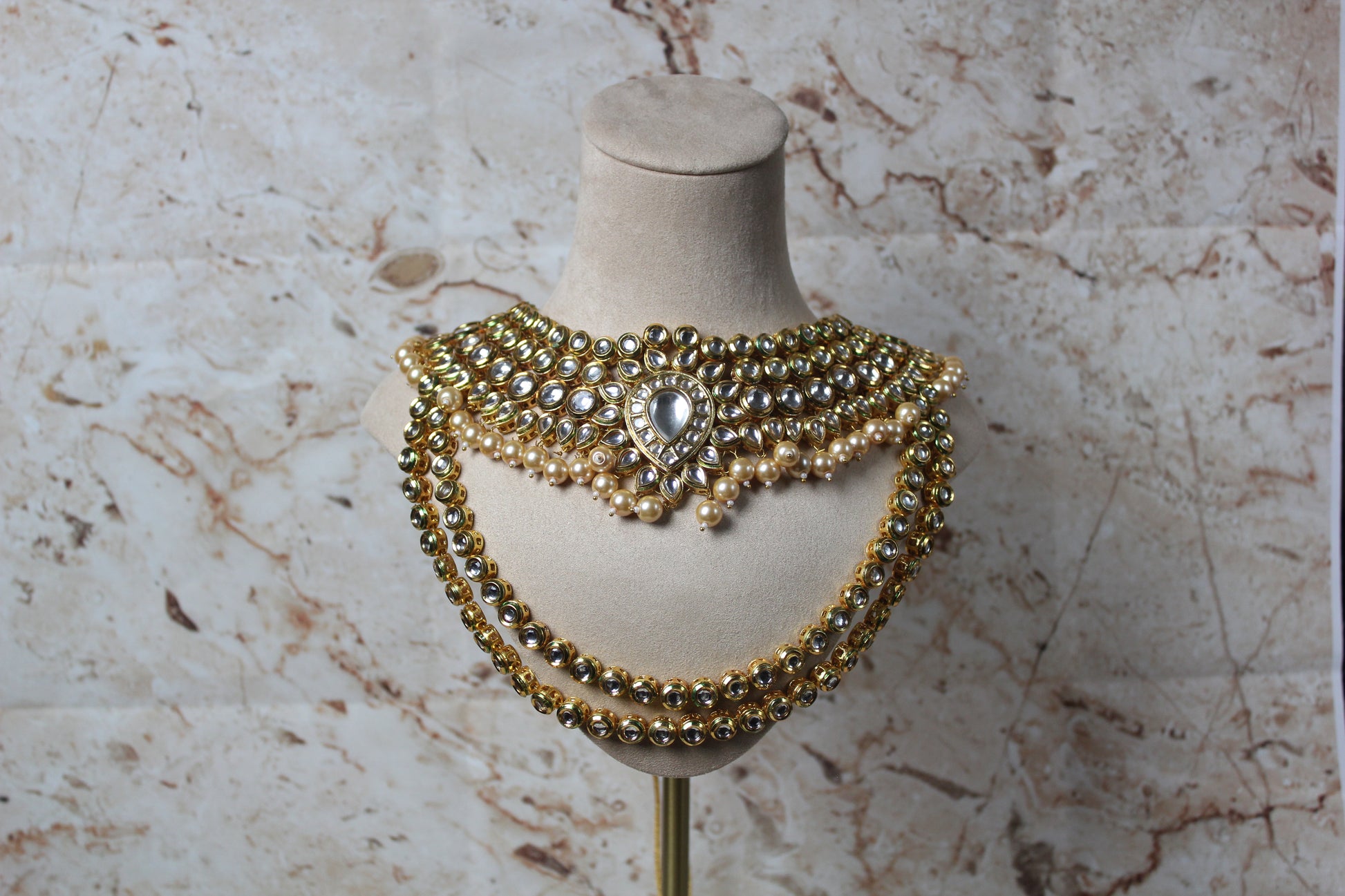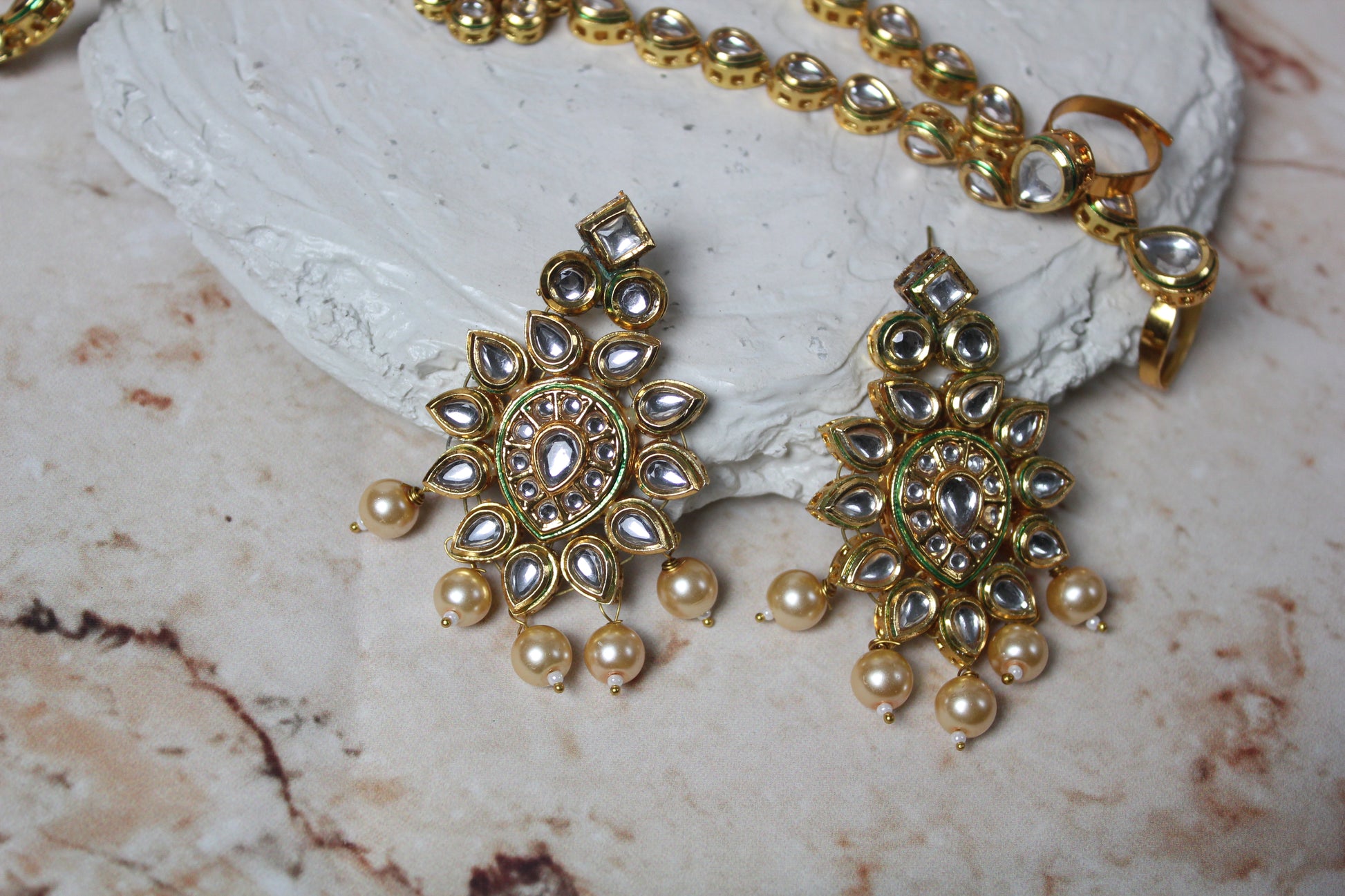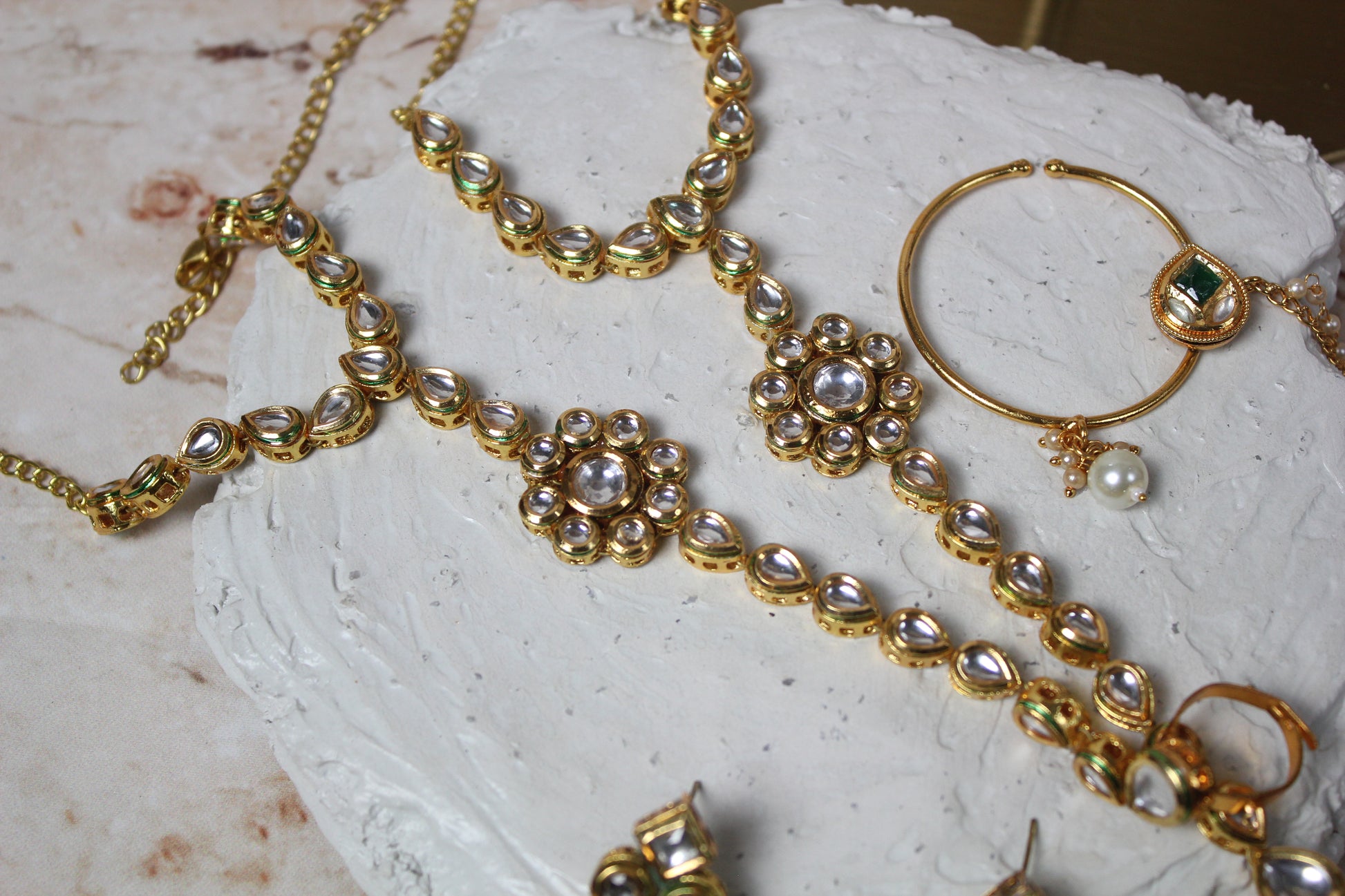A lightweight and stunning kundan set with an attached longer necklace to complete your look. This set comes with hand chains, earrings and nose ring.